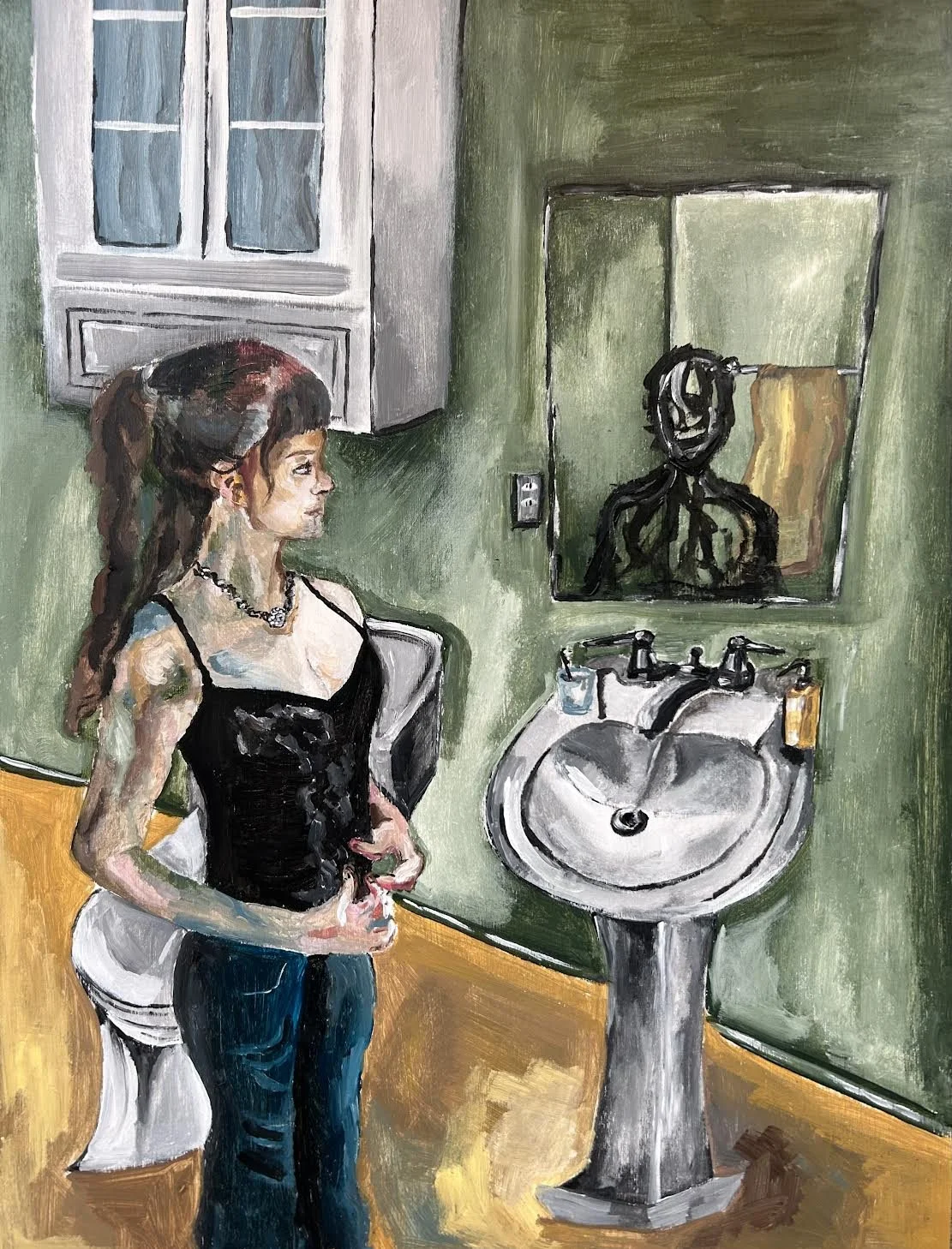 Girl and her reflection, 2023, acrylic on panel, 12 x 16 inches