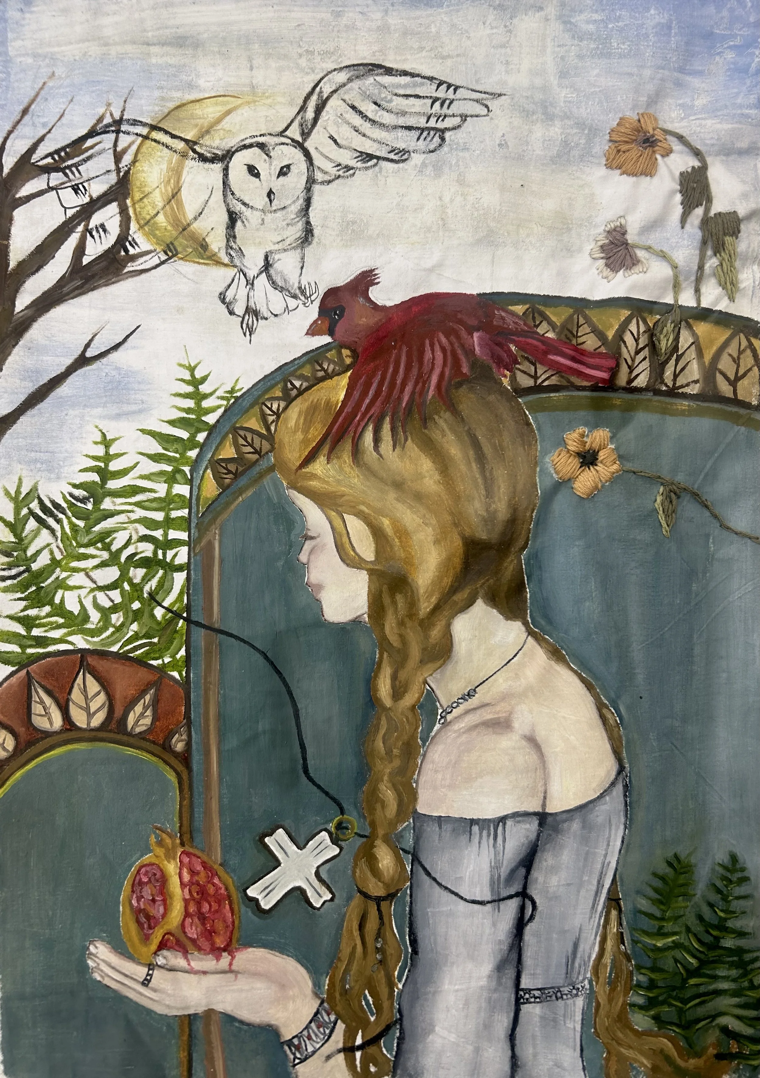 The Marigold Child, 2024, oil on canvas and embroidery, 16 x 20 inches