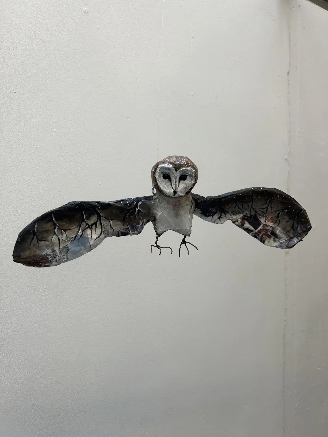 Sculptures Waiting Part II, 2025, wooden chair with oil paint details Home Sweet Home, 2024, Pine Wood, 7 ½ X 21 inches Metal Moon Candelabra, 2023, Metal Paper mache owl, 2023, paper, glue, acrylic Paint